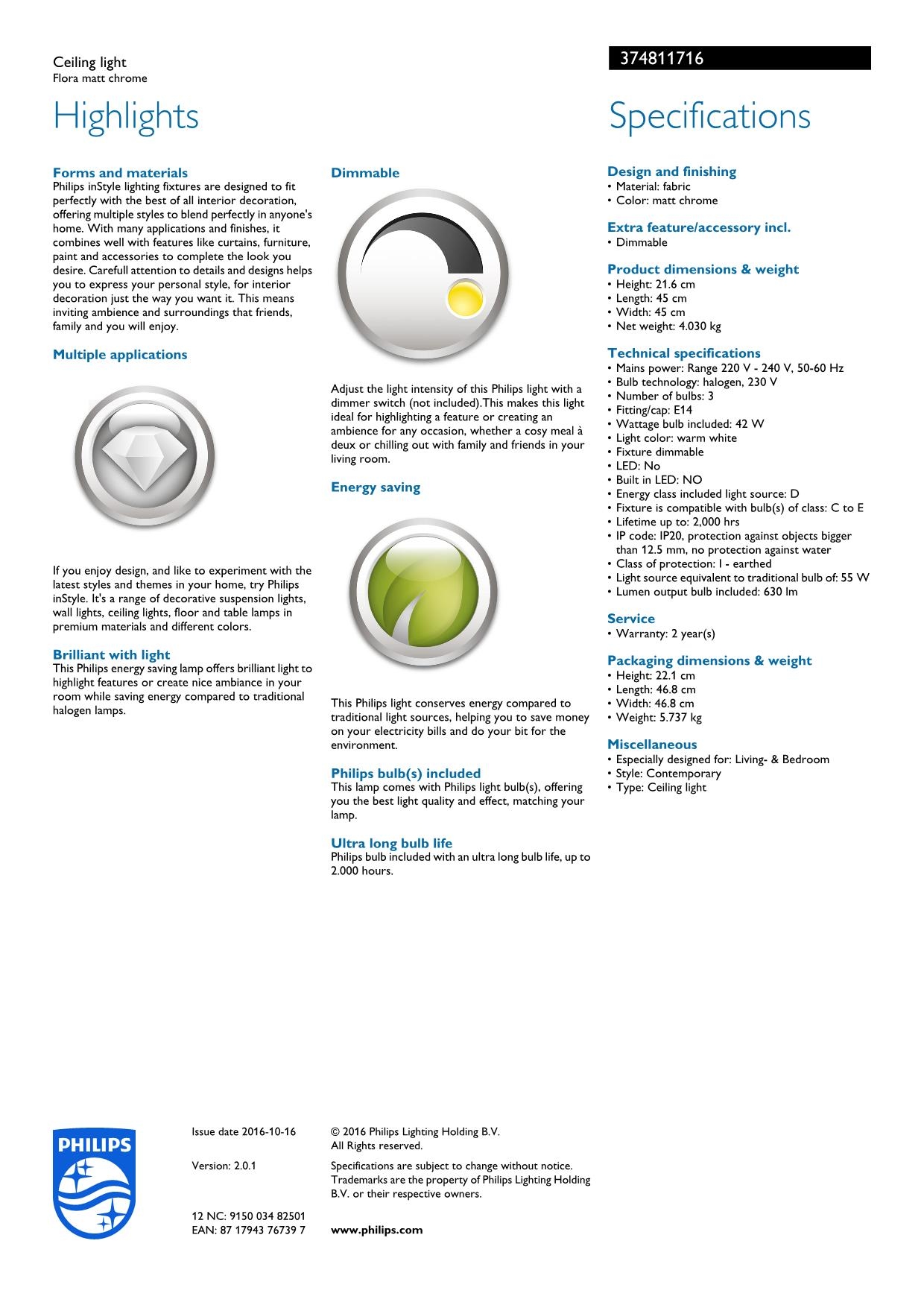 Люстра Philips 37481/17/16 одного из лучших производителей осветительных приборов имеет мощность 60 W и цоколь E14. Цвет основания данной модели: никель. Для производства использовали высококачественный материал: металл. Люстра 37481/17/16 выполнена в современном стиле с плафоном формы круг и крепится на пластину. Купить Люстра Philips 37481/17/16 вы можете в нашем интернет-магазине Лінія Свiтла.